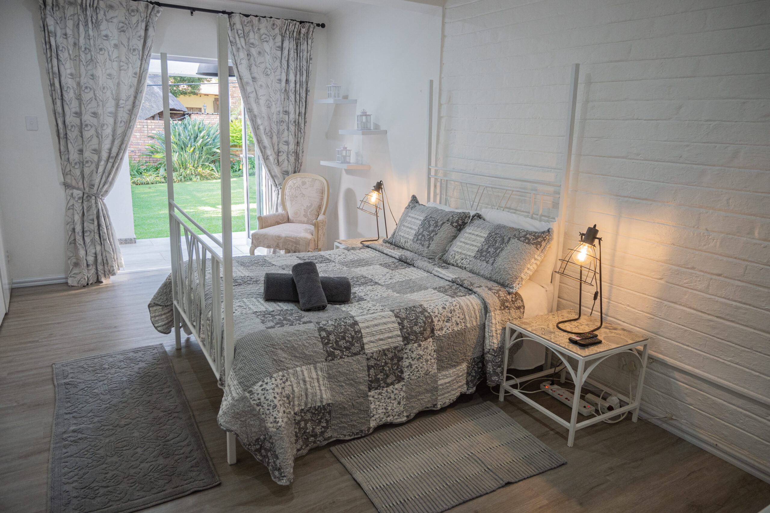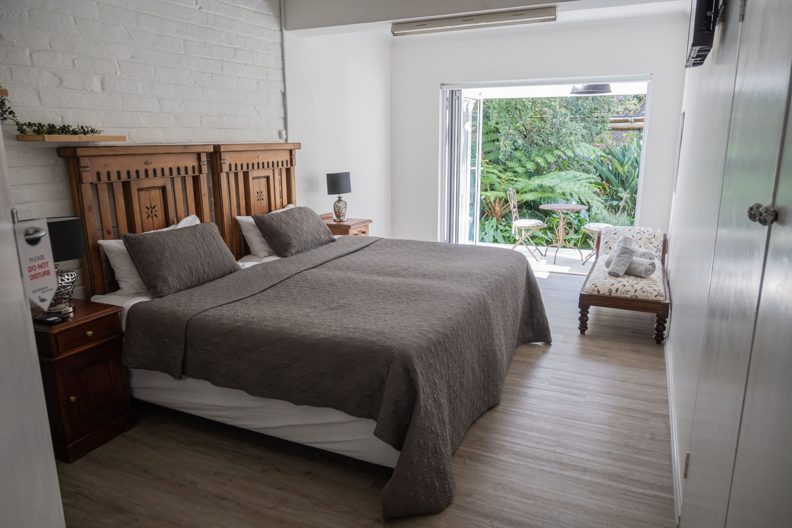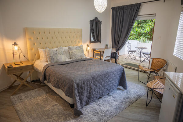 This modern spacious room is situated on the ground floor with sliding doors opening to an open patio and a beautiful leafy garden. The room include a Queen size bed, on suite – toilet, bath, and shower. Free Wi-Fi and television with Wi-Fi connectivity and DSTV. A dedicated working space is also available. There is a coffee station, microwave, and small fridge in the room. Laundry services are available at an additional cost, or you may request an iron-board as needed. This room has large storage clothing cupboards for longer stays. Breakfast can be included on request.