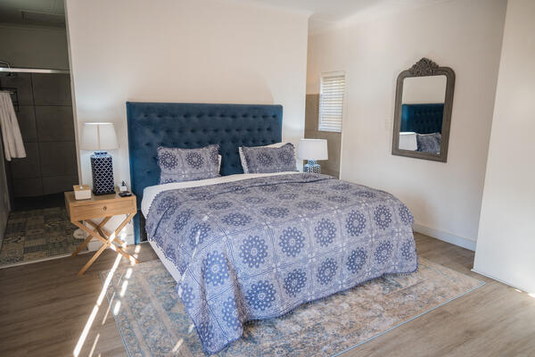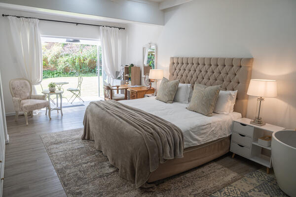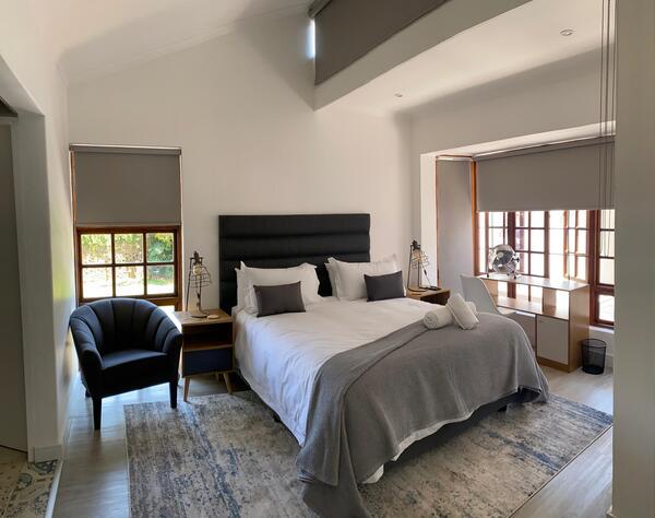 This modern spacious room is situated on the ground floor with sliding doors opening to a covered patio and a beautiful leafy garden. Look out for any visitors to the owl box in one of the trees. The room include a King size bed, on suite – toilet, bath and shower. Free Wi-Fi and television with Wi-Fi connectivity and DSTV. A dedicated working space is also available. There is a coffee station, microwave, and small fridge in the room. Laundry services are available at an additional cost, or you may request an iron-board as needed. This room has large storage clothing cupboards for longer stays. Breakfast can be included on request.